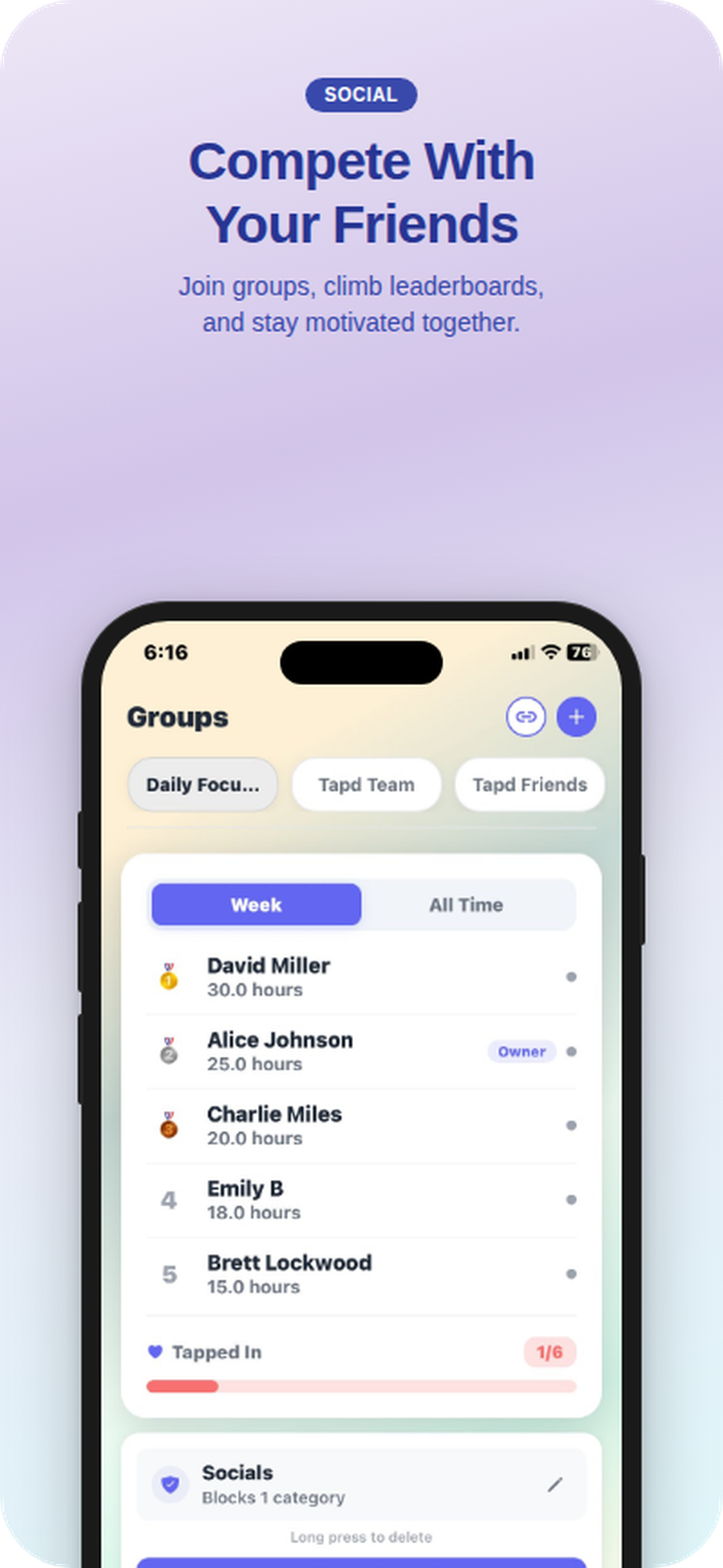 Join groups. Build streaks. Compete on leaderboards. Stay accountable.